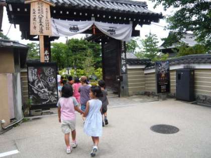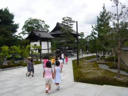 一通りの校区探検が終わると,建仁寺の境内を抜けて学校に戻りました。建仁寺の境内にある「新道児童館」の先生が,窓から身を乗り出して手を振ってくれました。