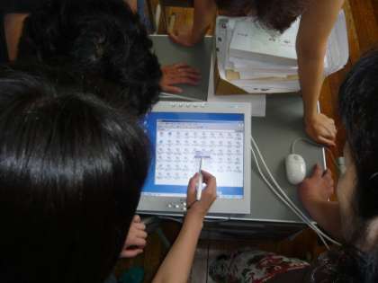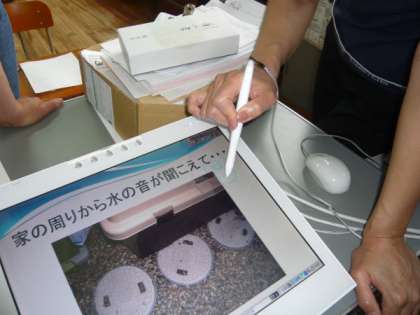 今年度毎月1回来校いただき「ICT機器」の活用方法や,ソフトの使い方などを教えていただいる「ICT活用支援員」の先生に,今回「ペンタブレット」の使い方を教えていただきました。ペンタブレットとコンピュータやプロジェクタの接続の仕方から始まり,その後ペンタブレットの使用法を詳しく教わりました。ペンで操作したり,ペンで文字を書いたり,その便利さに担任の方々は…。これから「ペンタブレット」の,争奪戦が始まりそうです。