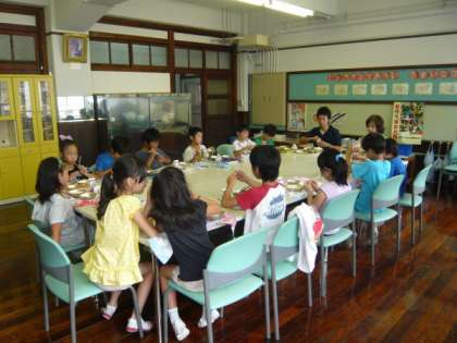 日ごろ給食は各学年の教室で食べていますが,今日は3年生が「ランチルーム」で給食を食べました。テーブルを囲んで子どもたちと担任の先生が座り,いつもとは違った雰囲気の中で,おいしそうに給食を食べていました。