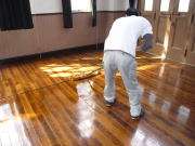 講堂の樹脂加工と掲示板の張り替えの様子です。