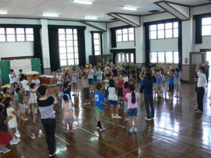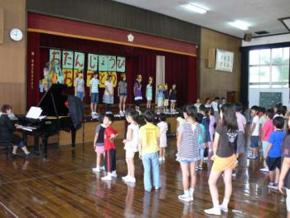 いよいよ終盤です。「地球が教室」を美しい声で歌って,歌のプレゼントをしました。最後に「もうじゅうがりにいこう」のゲームを全員で行って,第2回目の誕生児童集会を終えました。次回第3回目の誕生児童集会は,9月14日(月)1時間目に実施する予定です。