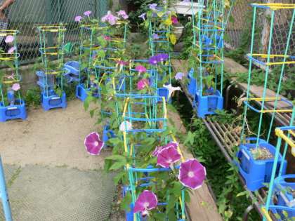1年生の子どもたち一人一人が,青い鉢で育てている「アサガオ」の花が満開です。青やピンク,紫など色とりどりの花が,梅雨の雨や夏の日差しを浴びて誇らしげに咲いています。間もなく夏休み,このアサガオの鉢は各家庭に持ち帰られ,最後のアサガオの花が咲くまで大切に育てられます。
