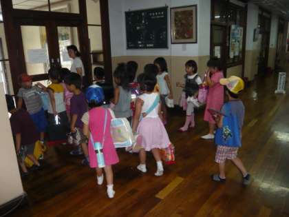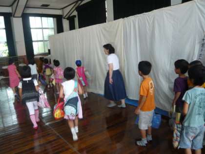 今日が初めての「夏休み」の1年生,チャレンジ学習を終えて全員が講堂に集合していました。何をしているのかとのぞいてみると,今日午後から始まる夏休みの「プール」の利用の仕方を,担任の先生から教わっていました。