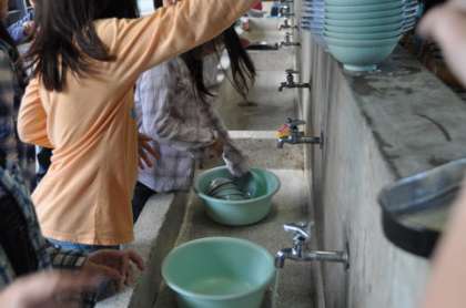 野外炊事では食事を作ることはもちろんですが,後片付けも大切な仕事の一つです。すすのいっぱいついた飯ごうや鍋を,みんなで協力して,手を真っ黒にして磨き上げたり,食器をきれいに洗ったりしました。