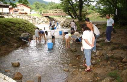 放流してもらった魚をつかまえる,「魚つかみ」もしました。つかまえた魚はすぐに塩焼きにしてもらって,おいしくいただきました。