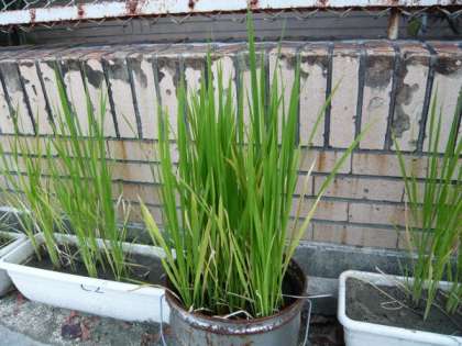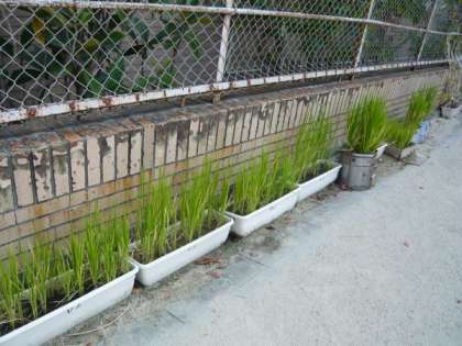 5年生がプランターやバケツ,缶などで育てている「稲」が,ご覧のように順調に育っています。夏休みも交代で水をやりに来て,大切に育てている「稲」,おいしいお米がとれることを,5年生の子どもたちは心待ちにしています。