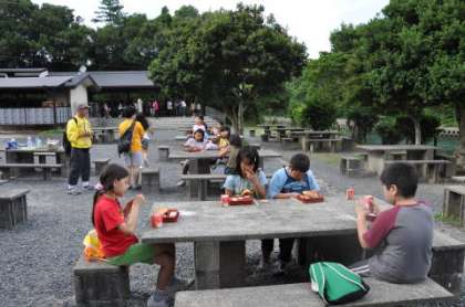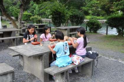 朝の集いが終わり,清掃をすませた後,午前7時40分から朝食を食べました。場所は,野外炊事場前の深谷水道が見える所で,美しい景色を見ながらおいしく朝食を食べました。