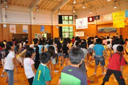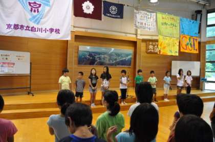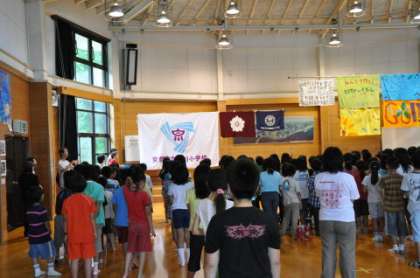 朝の集いの最初は,各校の旗揚げでした。続いて各校の代表が前に出て,みさきの家での思い出を一言ずつ話しました。そして朝の体操をして,朝の集いを終えました。