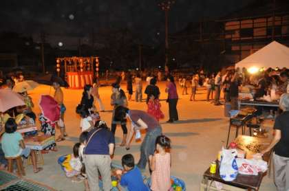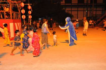 午後6時から開催されている「学区民納涼盆踊り」が,夜が更けるとともに盛り上がっています。午後7時過ぎから一時小雨が降ったものの,子どもたちや学区民のみなさんの姿が増えてきました。画像右のように,ペンギンさんも踊りの輪に加わり,楽しい盆踊りとなっています。「学区民納涼盆踊り」は午後9時までで,終わりまであと1時間と少し,過ぎゆく夏の一時を楽しく過ごしてほしいと思います。