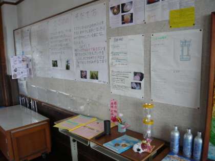 4年生の教室に,夏休みの作品が展示されています。掲示板には絵画作品や自由研究が,長机の上には工作の作品や日記が展示されています。いずれも力作ぞろい,9月8日(火)に授業参観で来校された,保護者のみなさんの目を楽しませることと思います。