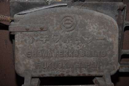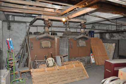 地下室の東端(本館地下北端)に,今は稼働していませんが「ボイラー室」があります。1辺約1.8mの立方体の形をしたボーイラーが2台設置されています。このボイラーの上から太いパイプが伸び,蒸気を校舎全体に行き渡らせてスチーム暖房していたようです。ボイラーには「トキワボイラー」,「SYOWA TEKKO」,「FUKUOKA JAPAN」などの文字が見えます。残念ながら製造年月日を書いた銘板もあるのですが,文字は消えてしまって判読不明です。また,ボイラーで焚いていた石炭は,馬車に満載して大和大路通の石炭投入口に横付けされ,ボイラー室に落とし込まれていたようです。