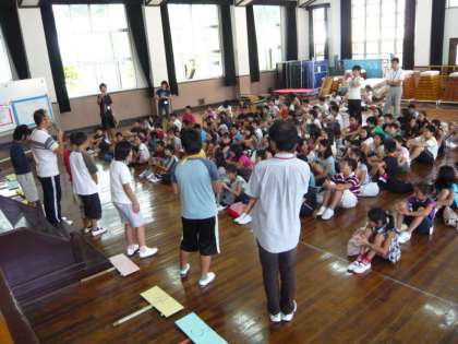 平成23年4月に東山開睛館開睛小学校として統合する5つの小学校(白川・新道・六原・清水・東山の各校)の5年生100人が本校講堂に集まり,10月19日(月)から24日(金)までの4泊5日,花背「山の家」で実施する野外活動の合同事前学習会を行いました。今年の合い言葉は「出会いを 大切にしよう」,今日の初めての出会いは,どうだったでしょうか?