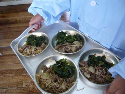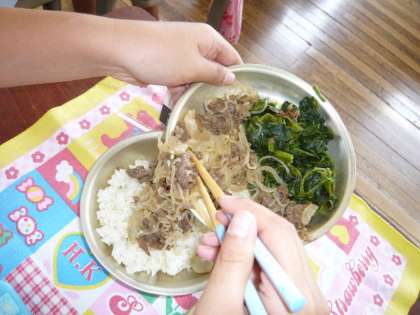 今日の給食は,「牛丼」でした。牛丼の具は,「牛肉」に「たまねぎ」,「糸こんにゃく」で,「三温糖」や「料理酒」,「うすくち醤油」,「こいくち醤油」などで味付けしてあり,麦ごはんにのせておいしくいただきました。