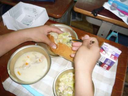 今日の給食は,「ツナサンド」でした。ツナサンドの具は,「マグロのフレーク」に「たまねぎ」,「キャベツ」で,「サラダ油」と「塩」,「こしょう」で味付けされたものに,マヨネーズソースをかけました。マヨネーズソースと具をしっかりと混ぜて,スプーンで2つに割ったコッペパンにはさんで,おいしくいただきました。
