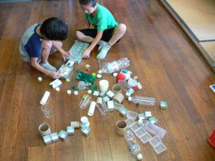 使った材料は,空き箱やペットボトル,牛乳パック,牛乳やペットボトルのキャップ,スプーンなど,生活科ルームに用意してあるものほとんどでした。これらの材料を同じもの,違うものを取り混ぜて,生活科ルームの床に「どんどんならべて」いくのですが,最初のうちはどうしようかと,1年生の子どもたちはやや思案顔…!