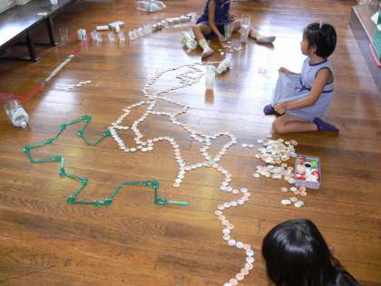 使った材料は,空き箱やペットボトル,牛乳パック,牛乳やペットボトルのキャップ,スプーンなど,生活科ルームに用意してあるものほとんどでした。最初は思案顔だった1年生も何かひらめいて,これらの材料を同じもの,違うものを取り混ぜて,生活科ルームの床に「どんどんならべて」いきました。ビルができたり,川や池,湖ができたり,最後には小さな街が完成したりもしました。友だちとなかよく協力して,楽しい造形活動ができました。