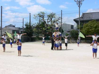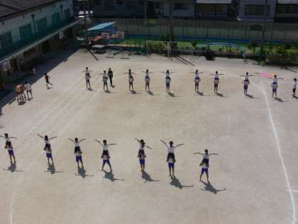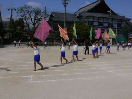 毎日がんばって練習している4〜6年生の「組体操」,今日は入場から退場までを通して練習していました。入場は画像でご覧のように,カラフルな旗を持って入場する子と,側転をしながら入場する子がいます。入場が終わると,一人技から順に全員でやる技までを通して練習し,最後に退場の仕方を確認して今日の練習を終えました。