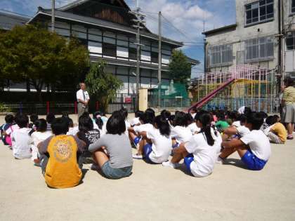 午前10時10分に震度5強の地震が発生し,校内放送によって状況の通報と地震が収まるのを待つ避難指示の一報が入りました。地震の揺れが収まると,次は家庭科室から火災が発生,校内放送の指示に従って子どもたちは無事に運動場に避難しました。運動場に集まった子どもたちは,校長先生の「おはしもて」の重要性や,「自分の命は自分で守る」ことの大切さなどのお話を,真剣に聞いていました。