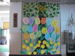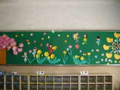 クラブの広場の南側の掲示板と新道の木の掲示板の,1年生を迎える掲示の様子です。