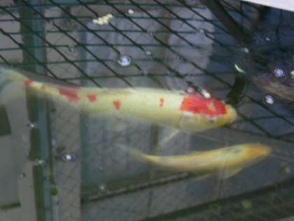 平成5年3月に運動場北東に設置された「観察池」に,2匹の緋鯉が住んでいます。1匹は体長60cm以上で,かなり前から観察池の住人で,観察池の主です。もう1匹は体長約30cmで,4年前に1匹では寂しいだろうと,体長10cmほどの幼魚を入れたものが大きく成長しました。この観察池にはこの2匹の鯉以外に,3年前に鴨川漁協の方から,5年生が鴨川探検の際にいただいた,鯉や鮒(ふな)も多数住んでいます。