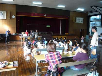 運動場では「花いっぱい運動」と「ストックアウト」が,講堂では「豆つかみ」と「輪投げ」,「ボーリング」,「缶バッジづくり」,「紙飛行機づくり」が,スタンプラリー形式で行われています。午後4時30分過ぎに,「カレーライス」で早めの夕食を食べ,その後「ビンゴゲーム」を楽しむ予定です。