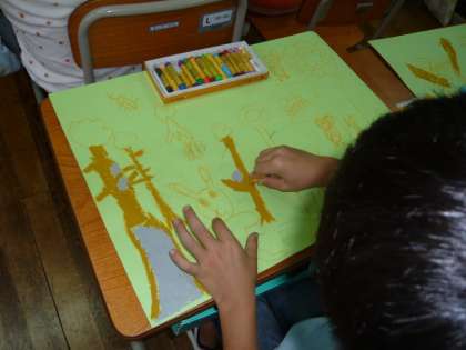 お話の題名は,「ファーディのはる」と「すてきなおへやをしょうかいします」の2作で,「ファーディのはる」には「ウサギ」や「キツネ」,「ネズミ」,「クマ」などの動物たちが,「すてきなおへやをしょうかいします」には「こぎつね」や「ウサギ」,「リス」,「ハリネズミ」などの動物たちが登場します。1年生の子どもたちは,下絵をしっかりと描いた後,クレバスを使ってがんばって色塗りをしていました。もうすぐ,素敵な「お話の絵」ができあがります。