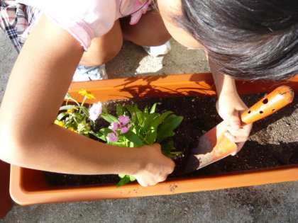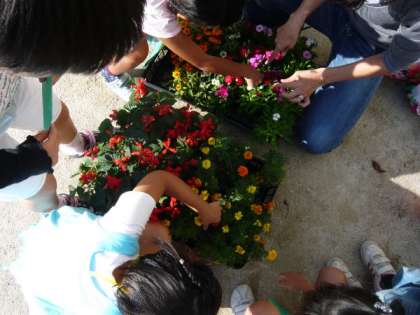 画像は,左から「ストラックアウト」,「花いっぱい運動」です。「花いっぱい運動」で花を植えられたプランターは,運動場周辺に飾られています。