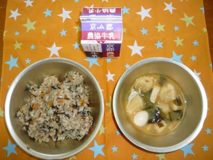今日の「台風用献立」は,「炊きこみ五目ごはん」,「牛乳」,「みそ汁」でした。