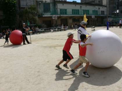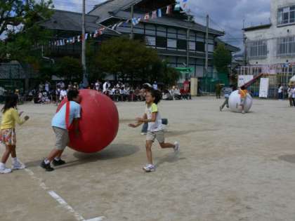 子どもたちの参加した4番目の競技は,紅白に分かれてリレーする「紅白大玉ころがし競走」でした。紅白20人ずつに分かれて,背丈ほどありそうな大玉を2人で転がして,旗を回ってリレーしていきました。上手に転がしているペア,息が合わずに大玉があっちに行ったり,こっちに行ったりするペア,白組が10mほどの差で勝ちました。