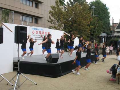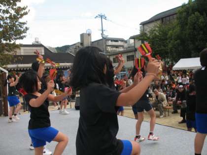 この心の交流広場には,東山区内の8つの小学校や保育園,幼稚園,中学校なども参加し,舞台で演奏や踊り,歌などを披露しています。今回の心の交流広場への本校の参加児童は3・4年生14名で,黒シャツに青パンツ姿で登場し,鳴子を両手に「鳴子踊り」を元気よく踊りました。フィニッシュもしっかりときまり,会場から大きな拍手を受けていました。