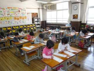 入学して4日目の1年生,今日1時間目に「かきかたえんぴつ」をしっかりと握りしめて,縦長の用紙に「はじめて なまえを かきました」。担任の先生から正しい鉛筆の持ち方を教えてもらい,用紙が動かないように押さえて,真剣にしっかりと,大きく自分の名前を書いていました。