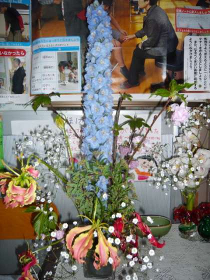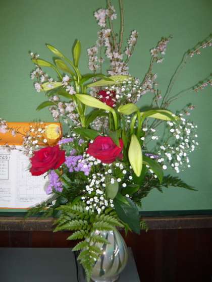 入学式で舞台を彩った花を,ご覧のように有効活用しています。