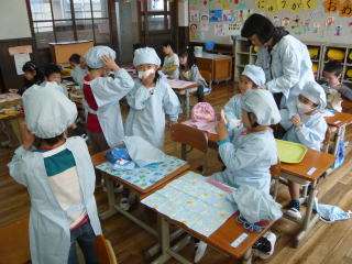画像は左から,「給食の用意」,「当番の服装」,「手洗い」です。