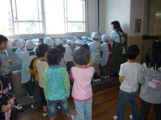 4月10日(金)から,平成21年度の給食が始まりました。小学校に入学して初めて給食を食べる1年生は,他の学年よりも少し早めに給食の準備をしました。当番の子はエプロンに帽子,マスクをかけて,手をきれいに洗って給食室に出発,大きな声で給食調理員さんに「いただきます!」の挨拶をして,食器や食缶を手に教室に戻りました。教室に戻ると,盛りつけと配膳をしましたが,担任の先生が…。配膳が終わると,手を合わせて「いただきます!」,1年生が初めての給食を口にしました。1年生の子どもたちは「給食おいしいな」,「おいしいよ」などと言いながら,しっかりと給食を食べていました。とってもおいしい給食,卒業するまでに何回食べるんでしょうね。ちなみに今日の給食は入学祝いの献立で,「小型コッペパン」,「牛乳」,「スパゲティのミートソース煮」,「ほうれん草のソティ」,「リンゴゼリー」でした。