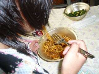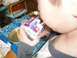 画像は左から,「みんなで「いただきます」」,「最初に牛乳を一口」」,「スパゲッティを…」です。