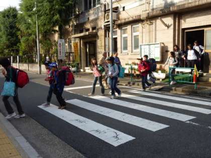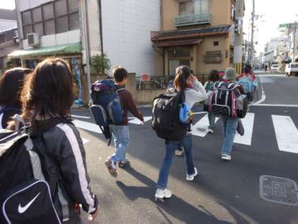 学校集合は午前8時,全員がそろうとすぐに出発式を行いました。出発式は,班長を先頭に集合し,代表の出発の言葉,校長先生のお話,担任の先生のお話と続きました。出発式が終わると,午前8時15分に学校を出発し,大和大路通を南下して,一路バスの待つ東大路通五条南西をめざしました。