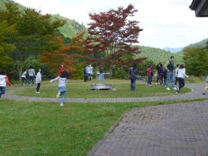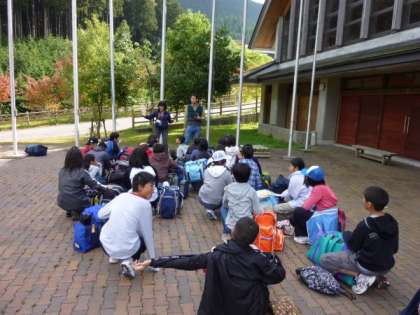 鞍馬街道を走っていると,鞍馬の火祭に使われる大きな松明が,家々の軒先に置かれているのが目にとまりました。バスは山の中を軽快に? 走り抜けて行きました。花背峠の頂上の気温計は12度を示し,街中とはかなり気温に差があることが分かりました。午前10時ちょうどに,バスは山の家に到着しました。白川,六原,東山の3校が到着するまで,しばらく間プレイホールの周りで,自由時間を楽しみました。