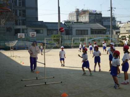 2年生の子どもたちは,去年1年生のときにもパスゲームを行っているので,1年生をリードして上手にバスをしたり,シュートしたりしていました。楽しく行うことができる「パスゲーム」,みんなで協力して行っています。