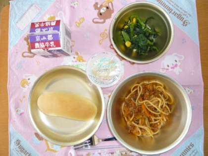 1年生の初めての給食は入学祝いの献立で,「小型コッペパン」,「牛乳」,「スパゲティのミートソース煮」,「ほうれん草のソティ」,「リンゴゼリー」でした。