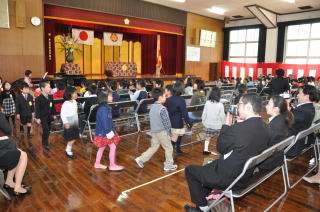 4月6日(月)午前10時から,平成21年度の「入学式」を開式しました。本年度の入学児童は例年より多く,男子9名,女子8名の17名でした。教頭先生の開式宣言で入学式は始まり,国歌と校歌の斉唱,学校長式辞,来賓祝辞と続きました。次に1年生担任と教職員の紹介,新1年生の担任からの紹介があり,最後に2年生の子どもたちの「お迎えの言葉」で入学式を締めくくりました。1年生の子どもたちは,校長先生や来賓のお話をしっかりと聞いたり,担任から名前を呼ばれたらしっかりと返事をしたりすることができていました。