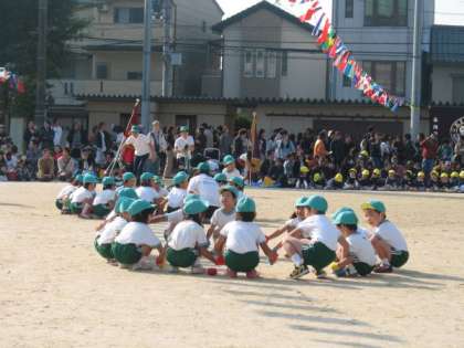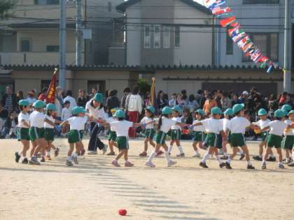 当日の演技は「サンバのちゃつちゃつちゃ」で,本校の運動会で見せてくれた演技をバージョンアップしたものでした。本校の運動会が終わっても,この連合大運動会をめざして給食時間の小学生が使わない時間に,本校の運動場でしっかりと練習を行っていました。連合大運動会には,光保育園を始め東山区内8つの保育園が参加し,どの園児さんも可愛い演技を見せてくれていました。