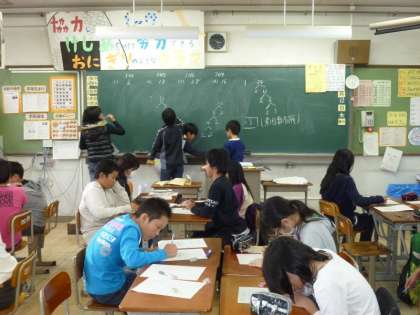 「数学」のグループは,3階の1年2組の教室で学習しました。学習の内容は「素数について」で,「12個の石の並べ方は何通りあるか?」から始まり,「素数の簡単な見つけ方」や「大きな素数・双子素数・回文素数」,「素因数分解」などでした。数学のグループの子どもたちは,最初,中学校3年生程度の内容と知らされビックリしたようでしたが,担当の先生が分かりやすく説明してくださって,がんばって難問を解いていました。