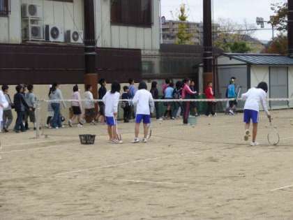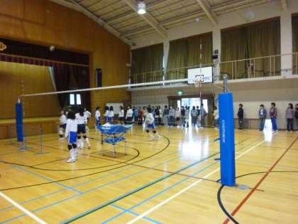 授業体験が終わると,次は部活動の見学でした。「数学」と「英語」の2グループで,特別教室と運動場,体育館でがんばって活動している,「部活動」の見学を行いました。特別教室では「美術部」が,運動場では「野球部」と「サッカー部」,「女子軟式テニス部」が,体育館では「男女バスケットボール部」と「女子バレーボール部」が活動していました。子どもたちは,がんばって活動している中学生の姿を,真剣に見つめていました。