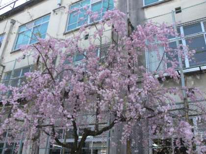 一番遅咲きの校庭東側,職員室西側の「しだれ桜」が,ご覧のようにやっと満開になりました。ここ2,3日が見ごろと思われます。大和大路通の「八重桜」と「ソメイヨシノ」は葉桜になりましたが,校庭西側の「しだれ桜」はまだたくさんの花を残しています。