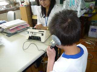 画像左は,「聴力検査」,右は「聴力検査を静かに待つ1年生」です。