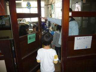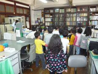 担任の先生と学校探検をしていた1年生が,「職員室に」やってきました。そっと職員室の扉を開けて,一人一人の1年生が「1年生の○○です。職員室に入らせてもらっていいですか?」と言って職員室に入りました。コンピュータやいろいろな書類,本などの並んだ机や書棚を興味深く見ていました。年度始めで,机の上が整理されていて…。1年生は明後日木曜日に,2年生と一緒に学校探検をします。