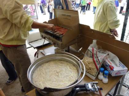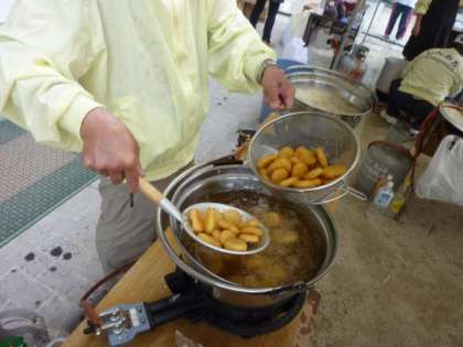 「新道もちつき大会」はもちつきだけでなく,「お楽しみコーナー」もありました。フランクフルトにチキンナゲット,フライドポテト,飲み物,綿菓子など,いずれも50円から100円で,飛ぶように売れていました。