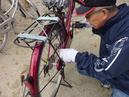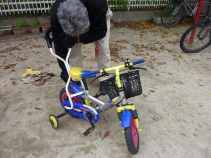 運動場の西側に,自転車屋さん2人による「自転車の点検整備」のコーナーも設けられていました。ドンドン持ち込まれる自転車に,お2人は大忙しの様子でしたが,さすがは専門家,手際よくスムーズに自転車の点検と整備が進んでいました。
