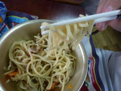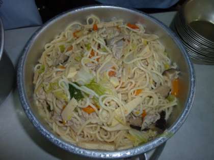 今日の給食は「五目ラーメン」でした。五目ラーメンの具は,「豚肉」,「にんじん」,「はくさい」,「しいたけ」,「白ねぎ」でした。また,スープは「チキンスープ」,「料理酒」,「塩」,「こしょう」,「しょうゆ」などで作られていました。