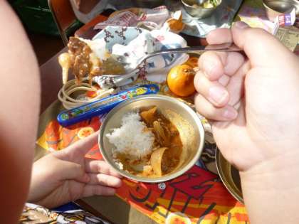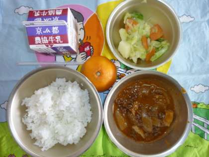 今日の給食の献立は,「ごはん」,「牛乳」,「ビーフストロガノフ」,「野菜のソティ」,「みかん」でした。「野菜のソティ」には,じゃがいも,にんじん,キャベツが入り,サラダ油と塩,こしょう,うすくちしょうゆで味付けされ,これもビーフストロガノフ同様,とてもおいしくいただきました。